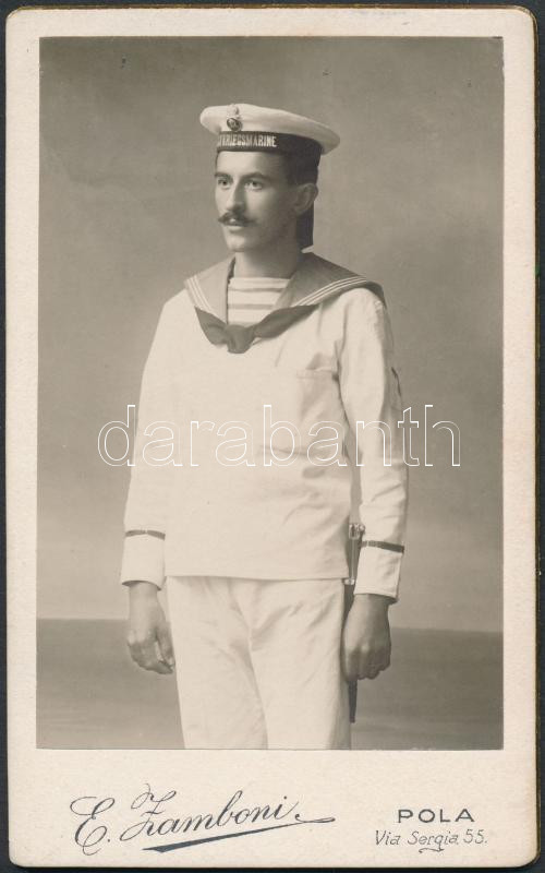 cca 1900 Osztrák-magyar matróz portréja. Keményhátú kabinetfotó E. Zam... https://www.darabanth.com/de/276-Fernauktion/276.0/Andere-Sammelgebiete/Militaria~200026/cca-1900-Osztrak-magyar-matroz-portreja-Kemenyhatu-kabinetfoto-E-Zamboni-polai-mutermebo~II1415123