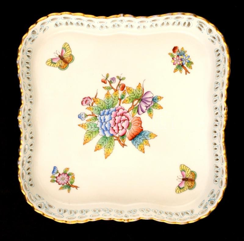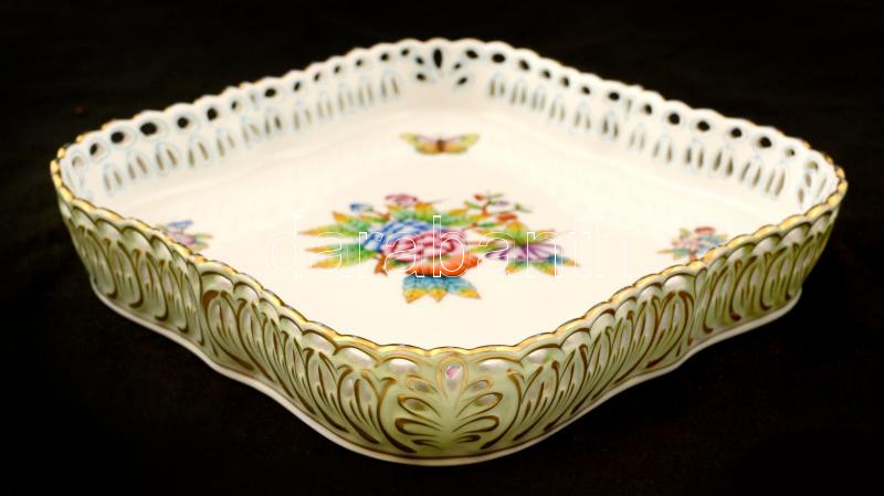 Beschreibung: Herendi Viktória mintás áttört tál, kézzel festett, jelzett, restaurált, 17×17 cm