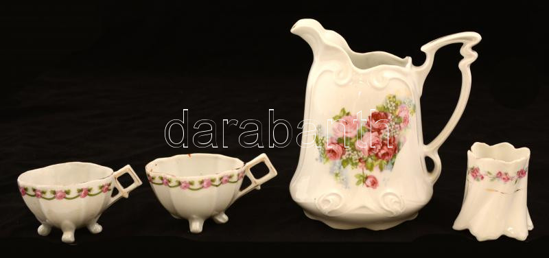 Virágmintás porcelán tétel: kancsó, m: 17 cm; 2 db csésze, m: 6 cm; fogpiszkáló tartó, m: 6 cm; jelzés nélkül, lekopásokkal, az egyik csésze sérült, összesen 4 db