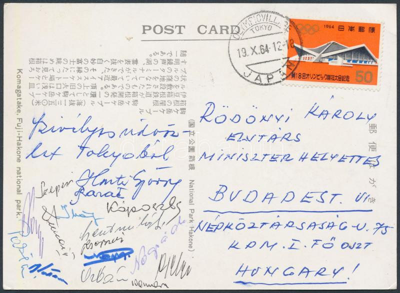 Beschreibung: 1964 Az olimpia bajnok magyar football válogatott tagjai által aláírt és hazaküldött képeslap