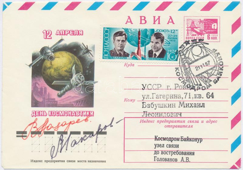 Beschreibung: Vaszilij Lazarjev (1928-1990) és Oleg Makarov (1933-2003) szovjet űrhajósok autopen aláírása emlékborítékon /
