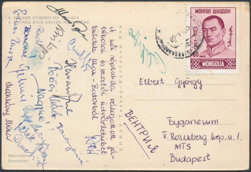 Beschreibung: cca 1965 A magyar női röplabda válogatott tagjai által aláírt és Ulan Batorból hazaküldött lap