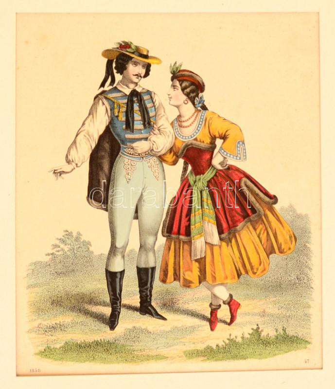 1858 Előkelő magyar pár, jelmez illusztráció, papír, színezett litográfia, paszpartuban, 17x20 cm. / 1858 Aristocratic hungarian couple, costume illustracion, paper, colored lithography, in paspartu, 17x20 cm.