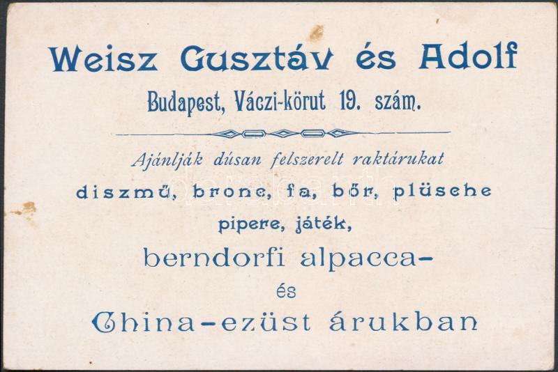 cca 1900 Budapest, Weisz Gusztáv és Adolf áruháza, Váczi körút 19. Lit... https://www.darabanth.com/de/276-Fernauktion/276.0/Andere-Sammelgebiete/Werbungen~200021/cca-1900-Budapest-Weisz-Gusztav-es-Adolf-aruhaza-Vaczi-korut-19-Litho-reklamkartya-Hun~II1412301