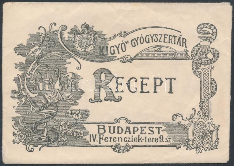 cca 1900 Kígyó gyógyszertár (Bp., Ferenciek tere) receptboríték https://www.darabanth.com/de/276-Fernauktion/276.0/Andere-Sammelgebiete/Werbungen~200021/cca-1900-Kigyo-gyogyszertar-Bp-Ferenciek-tere-receptboritek~II1409425
