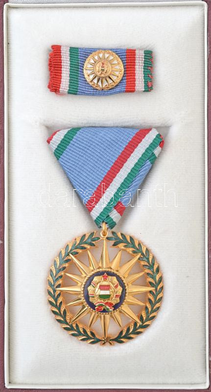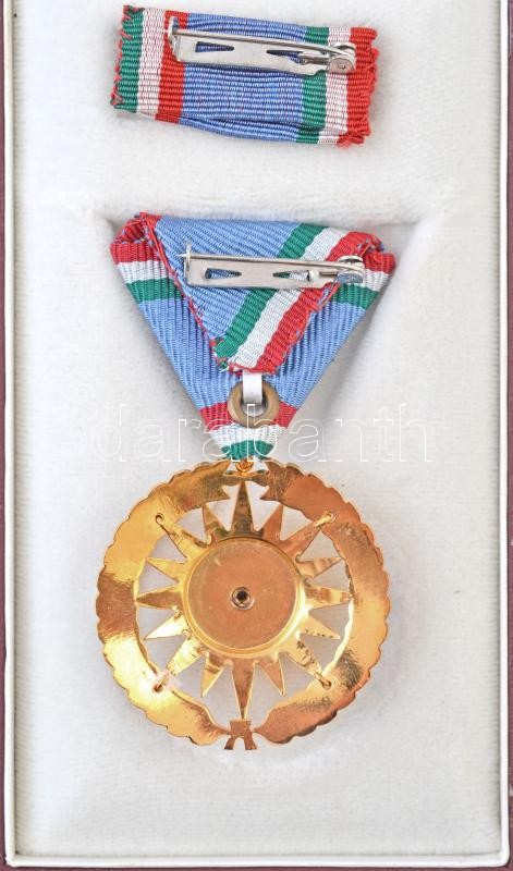 1976. "Szocialista Magyarországért Érdemrend" aranyozott, zománcozott Br kitüntetés mellszalaggal, szalagsávon miniatűrrel, adományozói dísztokban. Az érdemrend jelvényét Csúcs Viktória (1934- ) tervezte. T:1- Hungary 1976. "Order of Merit for the Socialist Hungary" gilt, enamelled Br decoration on ribbon, with miniature and thin ribbon, in original case. The badge of the order designed by Viktória Csúcs (1934- ) C:AU NMK 715.
