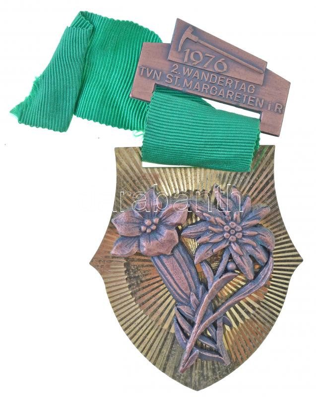 Ausztria 1976. "TVN (Természetbarát Turistaszövetség) 2. vándornap - Sankt Margarethen in Römersteinbruch " fém jelvény, havasi gyopár motívum, "R. Souval Wien 7." gyártói jelzéssel (~58x69mm) T:2 Austria 1976. "TVN (Touristenverein die Naturfreunde) 2. Wandertag Sankt Margarethen in Römersteinbruch" metal badge, Edelweiss motive, with "R. Souval Wien 7." makers mark (~58x69mm) C:XF