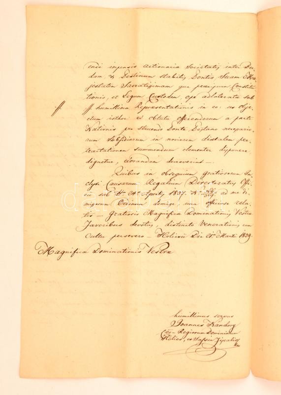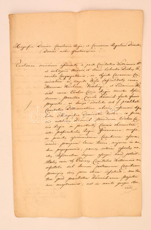 1839 Nándory János (1801-?) a holicsi és sasvári királyi uradalmi ügyvéd, későbbi nyitrai kormánybiztos (1849) latin nyelvű levele azonosítatlan királyi ügyigazgatóhoz Kossovich Károly (1803-1841) ügyvéd, jogtudós előterjesztése tárgyában, hivatkozással Wesselényi Miklós és Kossuth Lajos nemrég lezárt hűtlenségi pereire
