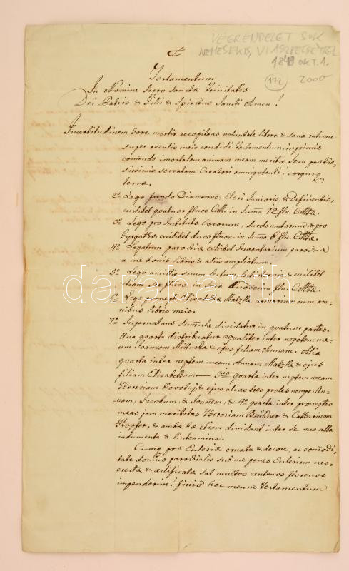 1849 Latin nyelvű végrendelet, aláírásokkal, viaszpecsétekkel https://www.darabanth.com/de/277-Fernauktion/277.0/Andere-Sammelgebiete/Dokument~16/1849-Latin-nyelvu-vegrendelet-alairasokkal-viaszpecsetekkel~II1418903