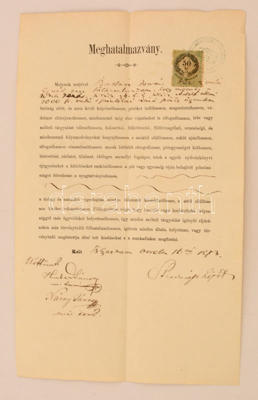 1873 Ügyvéd számára kiadott személyes képviseletre jogosító meghatalma... https://www.darabanth.com/de/277-Fernauktion/277.0/Andere-Sammelgebiete/Dokument~16/1873-Ugyved-szamara-kiadott-szemelyes-kepviseletre-jogosito-meghatalmazas-50kr-okmanybel~II1420600