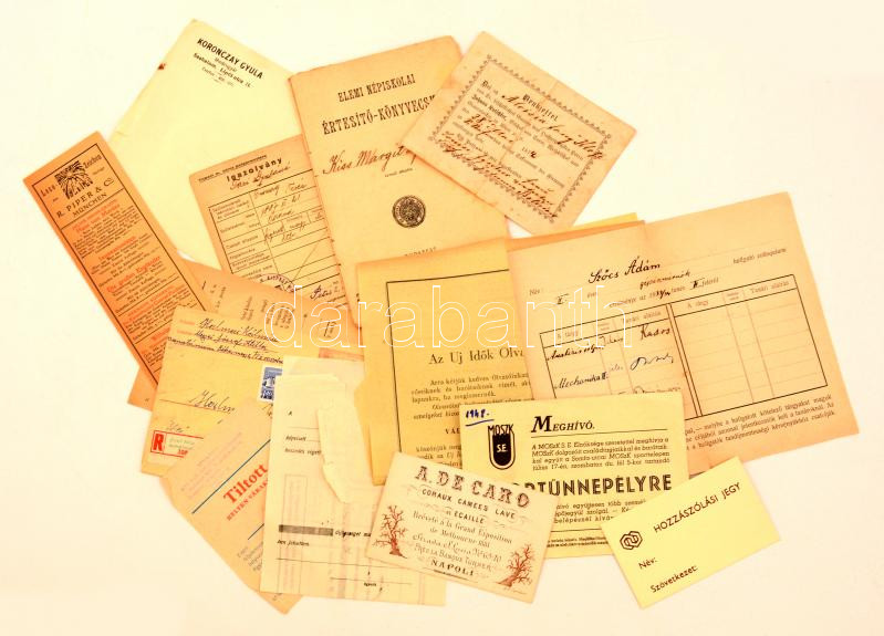 Beschreibung: 1874-1948 Vegyes okmány/nyomtatvány tétel(igazolvány, cégjelzéses levélpapír, reklámkönyvjelző, meghívó, elemi népiskolai értesítő, díjkötelezvény, stb.), 14 db