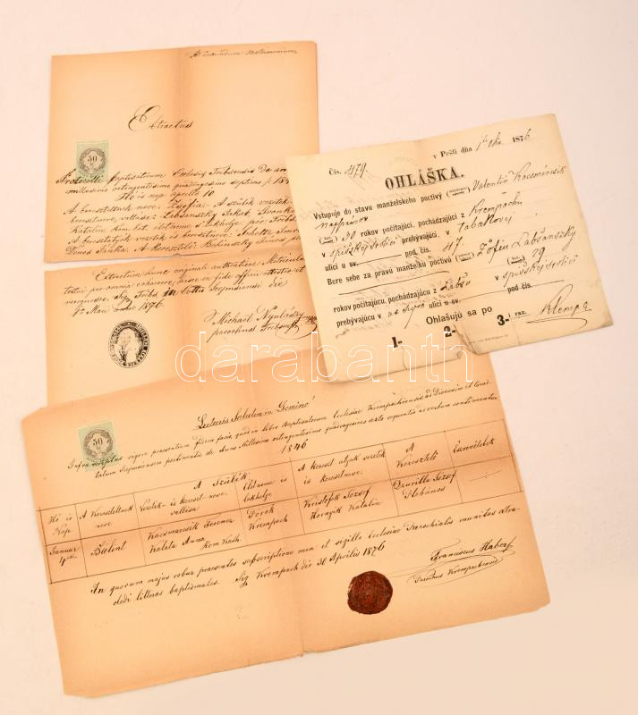 Beschreibung: 1876 Házassági hirdetési bizonyítvány Lófay Antal és Vojtko Zsuzsanna házasságáról ( 2 hirdetés, 1 keresztlevél)