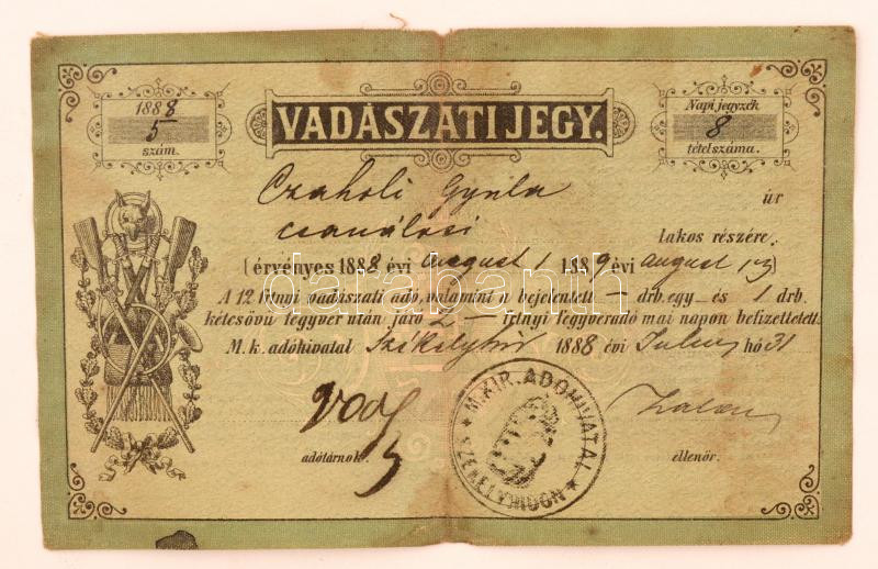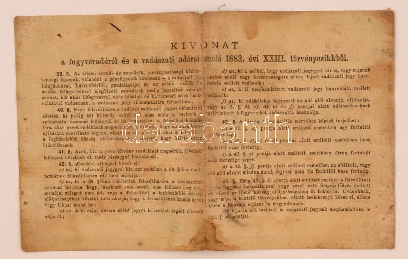 1888 Vadászati jegy, kissé megviselt állapotban / Hunter licence, slig... https://www.darabanth.com/de/277-Fernauktion/277.0/Andere-Sammelgebiete/Dokument~16/1888-Vadaszati-jegy-kisse-megviselt-allapotban-Hunter-licence-slightly-damaged~II1417854