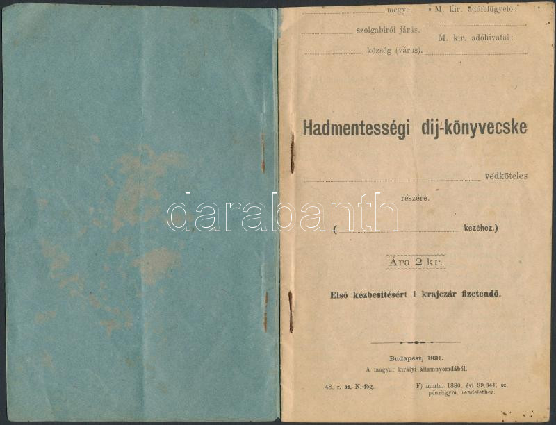 1894 Hadmentességi díjkönyvecske. 20x12 cm. https://www.darabanth.com/de/277-Fernauktion/277.0/Andere-Sammelgebiete/Dokument~16/1894-Hadmentessegi-dijkonyvecske-20x12-cm~II1416598