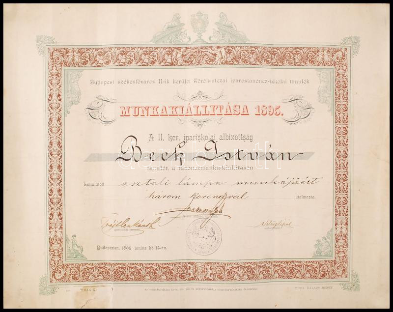 1895 Munkakiállítás tanonc oklevél, gyűrött, kis szakadással, 30x39cm https://www.darabanth.com/de/277-Fernauktion/277.0/Andere-Sammelgebiete/Dokument~16/1895-Munkakiallitas-tanonc-oklevel-gyurott-kis-szakadassal-30x39cm~II1292016