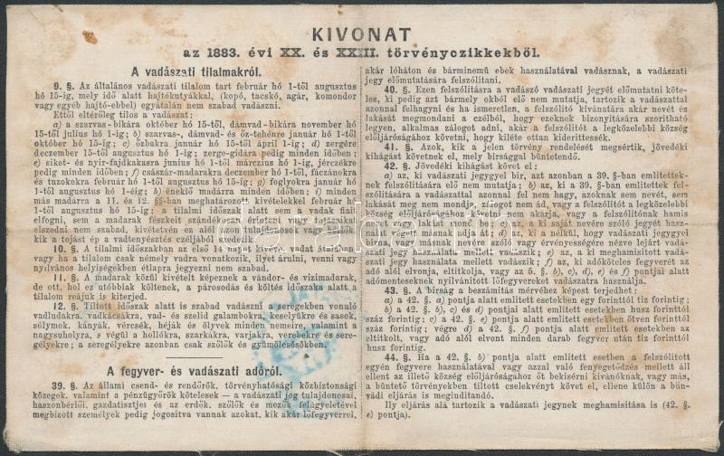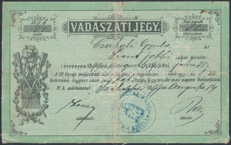 1899 Vadászati jegy / vadászjegy. Kissé megviselt / Hunting licence https://www.darabanth.com/de/277-Fernauktion/277.0/Andere-Sammelgebiete/Dokument~16/1899-Vadaszati-jegy-vadaszjegy-Kisse-megviselt-Hunting-licence~II1425538