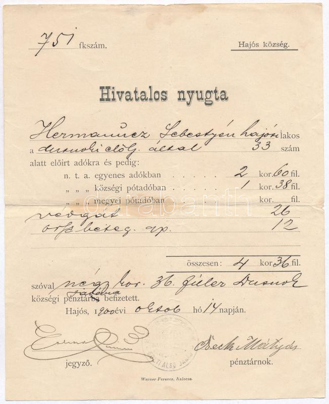 1900 Hajós község, hivatalos nyugta adó befizetéséről, hajtva https://www.darabanth.com/de/277-Fernauktion/277.0/Andere-Sammelgebiete/Dokument~16/1900-Hajos-kozseg-hivatalos-nyugta-ado-befizeteserol-hajtva~II1418230