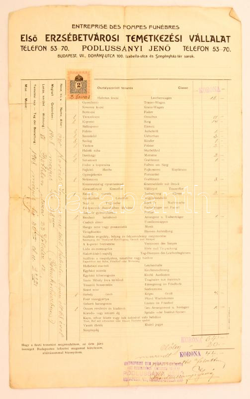 1908 Bp., Az Első Erzsébetvárosi Temetkezési Vállalat számlája, 2 fill... https://www.darabanth.com/de/277-Fernauktion/277.0/Andere-Sammelgebiete/Dokument~16/1908-Bp-Az-Elso-Erzsebetvarosi-Temetkezesi-Vallalat-szamlaja-2-filler-okmanybelyeggel~II1418595