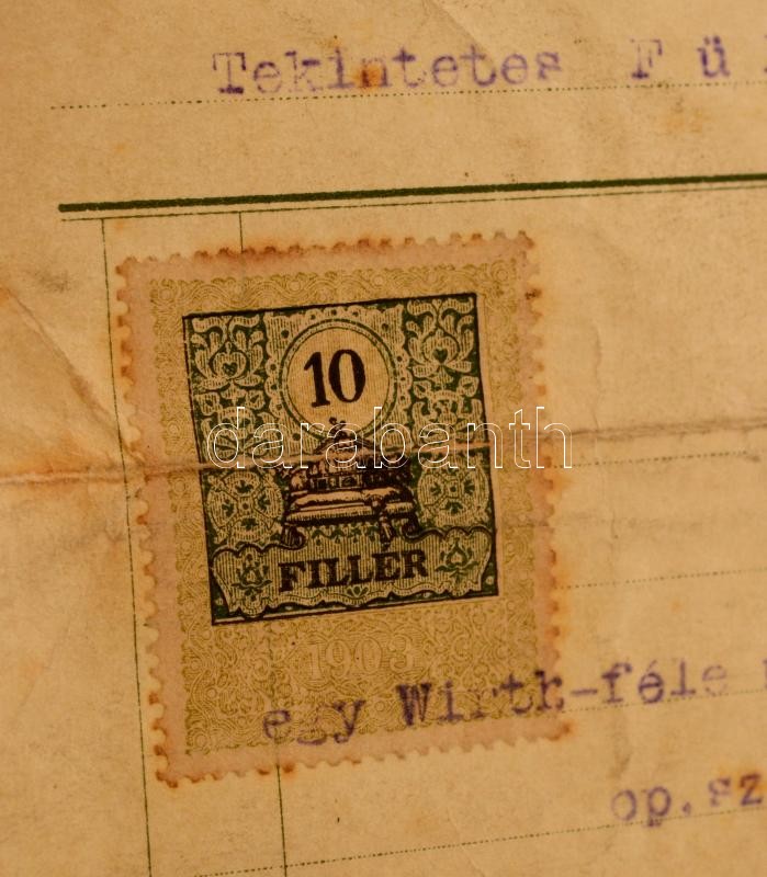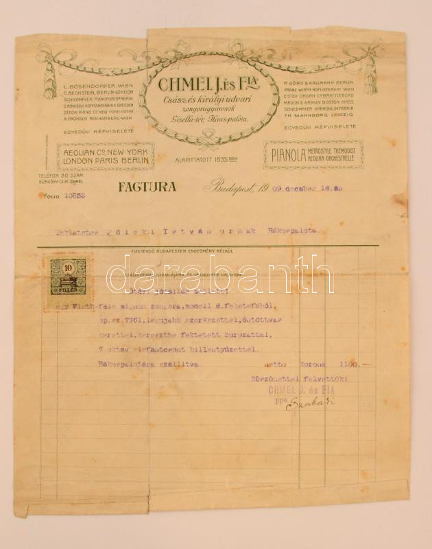 1909 Chmel J. és fia budapesti zongoragyárosok fejléces, kézzel írt számlája és jótállása eladott Wirth-féle mignon zongoráról, 10f okmánybélyeggel, hajtva, szakadt / antique invoice and warranty for piano