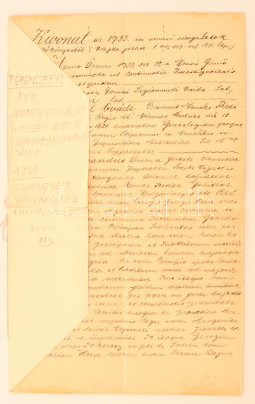 Beschreibung: 1909 Szombathely, Kivonat az 1173. évi nemesi vizsgálatok jegyzőkönyvéből