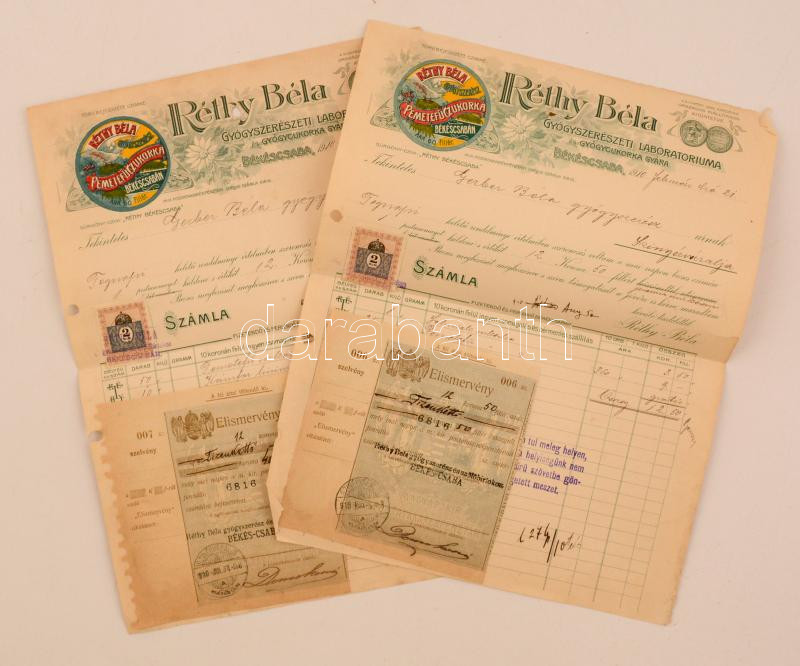 1910 Réthy Béla békéscsabai gyógyszerész, 2 db díszes fejléces számla ... https://www.darabanth.com/de/277-Fernauktion/277.0/Andere-Sammelgebiete/Dokument~16/1910-Rethy-Bela-bekescsabai-gyogyszeresz-2-db-diszes-fejleces-szamla-2f-okmanybelyeggel-~II1417435