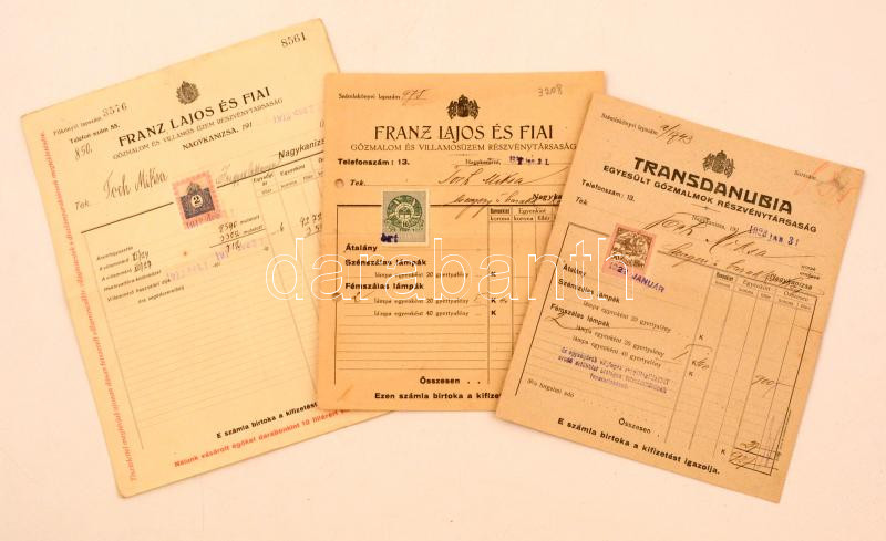 1913-1923 Nagykanizsa, Transdanubia Egyesült Gőzmalmok Részvénytársaság és Franz Lajos és Fiai Gőzmalom és Villamosüzem Részvénytársaságának fejléces számlája, 3 db, okmánybélyegekkel