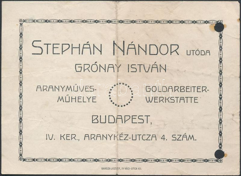 1913 Bp., Stephán Nándor utóda Grónay István Aranyműves műhelye nyugta https://www.darabanth.com/de/277-Fernauktion/277.0/Andere-Sammelgebiete/Dokument~16/1913-Bp-Stephan-Nandor-utoda-Gronay-Istvan-Aranymuves-muhelye-nyugta~II1420528