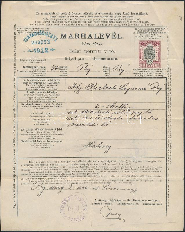 Beschreibung: 1914 Hunyad vármegyei marhalevél lóvásárra, 20f kiegészítő illetékbélyeggel, hajtva / Vieh-Pass, veterinary certificate