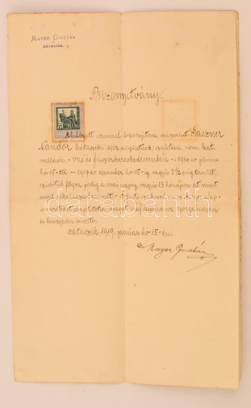 1919 Bátaszék, Mayer Gusztáv vas- és fűszerkereskedő által kiállított ... https://www.darabanth.com/de/277-Fernauktion/277.0/Andere-Sammelgebiete/Dokument~16/1919-Bataszek-Mayer-Gusztav-vas-es-fuszerkereskedo-altal-kiallitott-bizonyitvany-aja~II1418226