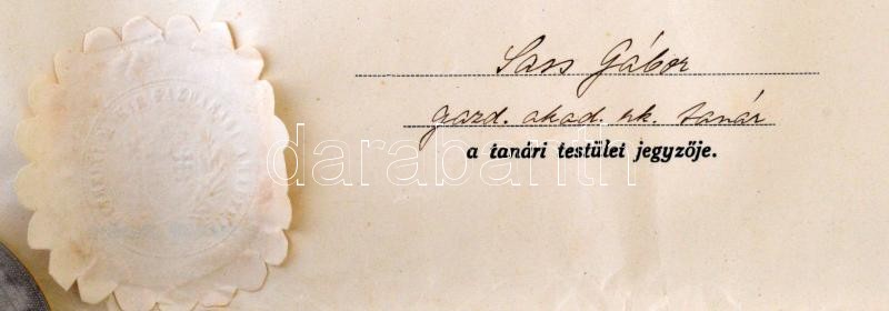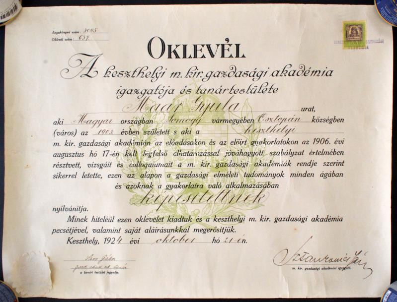 1924 A keszthelyi Magyar Királyi Gazdasági Akadémia oklevele, okmánybélyeggel, szárazpecséttel, Sztankovics János (1869-1938) igazgató és Sass Gábor (1891-1980) egyetemi tanár aláírásával, eredeti tokban, jó állapotban.