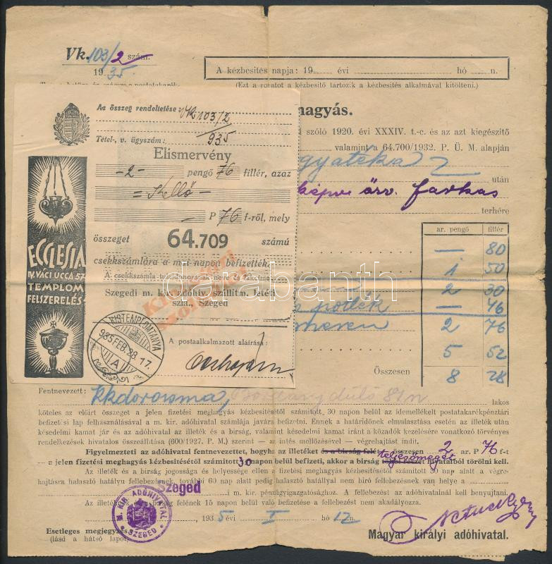 Beschreibung: 1935 Fizetési meghagyás elismervénnyel