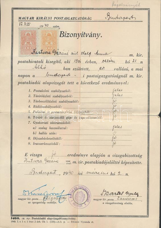 Beschreibung: 1940 Bp., A Magyar Királyi Postaigazgatóság által kiállított bizonyítványok és hivatali eskü letételéről szóló igazolvány, 3 db, okmánybélyegekkel
