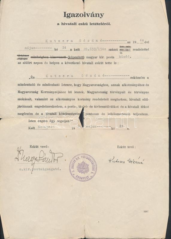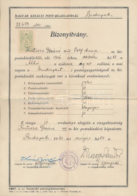 1940 Bp., A Magyar Királyi Postaigazgatóság által kiállított bizonyítv... https://www.darabanth.com/de/277-Fernauktion/277.0/Andere-Sammelgebiete/Dokument~16/1940-Bp-A-Magyar-Kiralyi-Postaigazgatosag-altal-kiallitott-bizonyitvanyok-es-hivatali-esk~II1418656