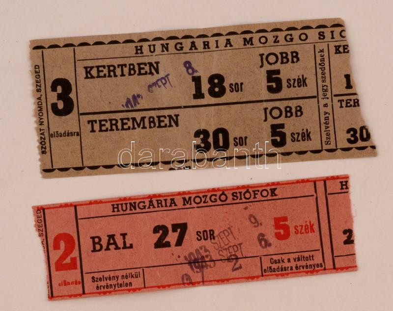 1943 Siófok, 2 db belépőjegy a Hungária Mozgóba https://www.darabanth.com/de/277-Fernauktion/277.0/Andere-Sammelgebiete/Dokument~16/1943-Siofok-2-db-belepojegy-a-Hungaria-Mozgoba~II1394364