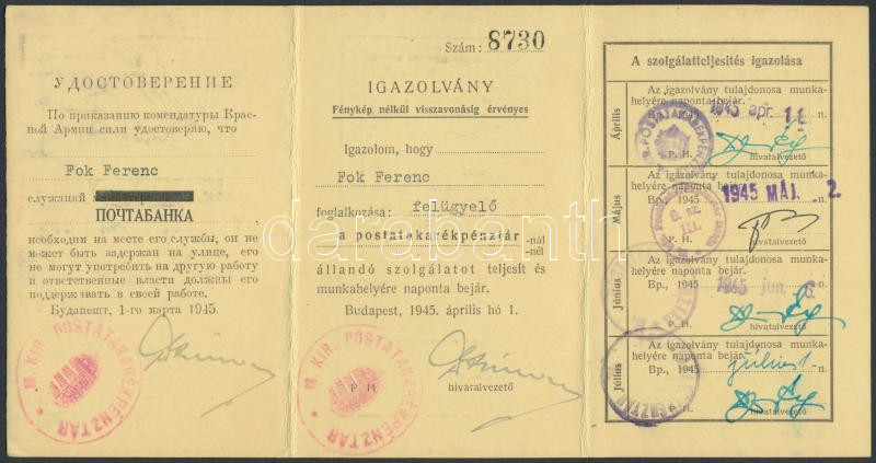 Beschreibung: 1945 Magyar-orosz nyelvű munkaviszony-igazolás postatakarékpénztári felügyelő részére, bejegyzésekkel