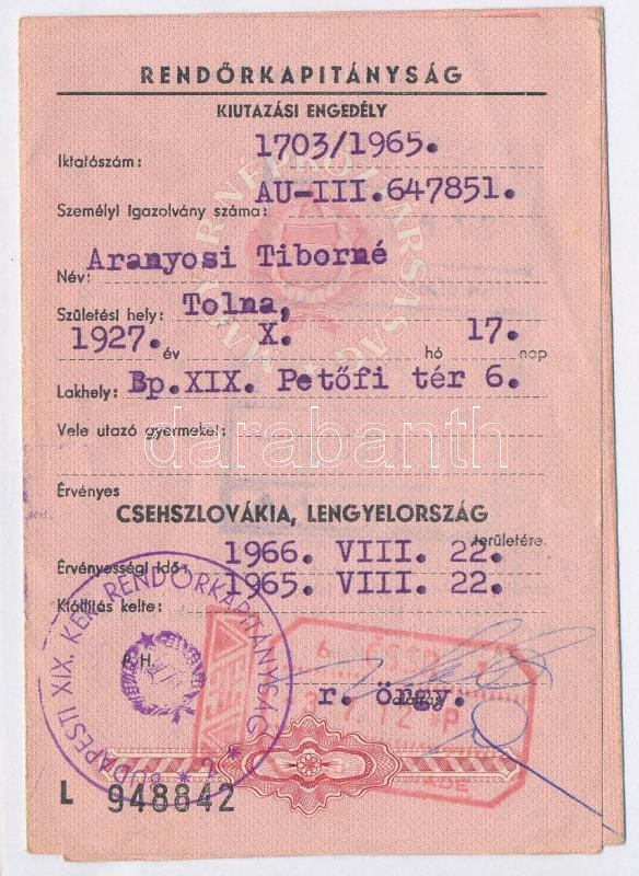1965-66 Budapest XIX. ker., rendőrkapitánysági kiutazási engedély Cseh... https://www.darabanth.com/de/277-Fernauktion/277.0/Andere-Sammelgebiete/Dokument~16/1965-66-Budapest-XIX-ker-rendorkapitanysagi-kiutazasi-engedely-Csehszlovakia-es-Lengyelors~II1397907