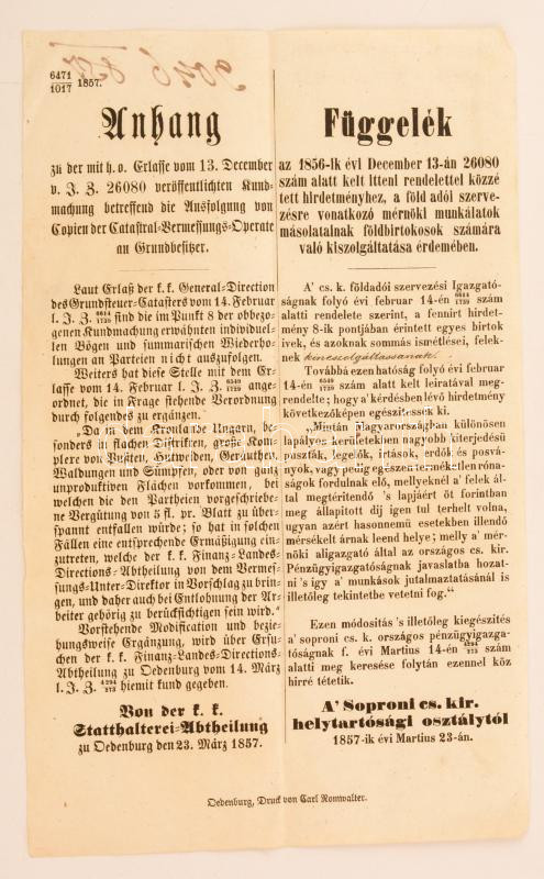 1857 A soproni cs. kir. helytartósági osztály által kiadott függelék a... https://www.darabanth.com/de/277-Fernauktion/277.0/Andere-Sammelgebiete/Drucksachen~28/1857-A-soproni-cs-kir-helytartosagi-osztaly-altal-kiadott-fuggelek-a-foldadoval-kapcsolatb~II1418853