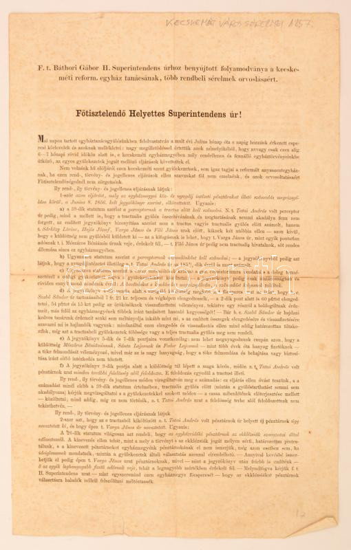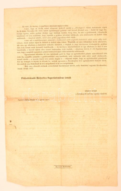 1857 Kecskemét, A kecskeméti református egyház tanácsának folyamodvány... https://www.darabanth.com/de/277-Fernauktion/277.0/Andere-Sammelgebiete/Drucksachen~28/1857-Kecskemet-A-kecskemeti-reformatus-egyhaz-tanacsanak-folyamodvanya-serelmeinek-orvosla~II1418840