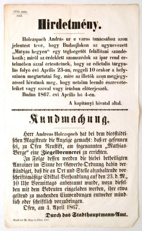 Beschreibung: 1867 Budapest kapitányi hivatalának hirdetménye a Mátyás-hegyen építendő Holtzspach-téglaégető tárgyában, magyar és német nyelven,38,5×23 cm