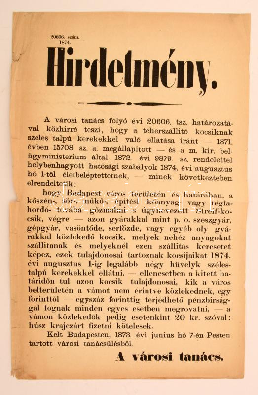 1873 Bp., A városban közlekedő kocsik kerékszabványáról szóló hirdetmé... https://www.darabanth.com/de/277-Fernauktion/277.0/Andere-Sammelgebiete/Drucksachen~28/1873-Bp-A-varosban-kozlekedo-kocsik-kerekszabvanyarol-szolo-hirdetmeny-hajtott-42x26-c~II1423011