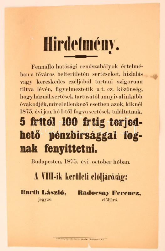 1875 Bp., Hirdetmény a főváros belterületén a sertések tartásának tilt... https://www.darabanth.com/de/277-Fernauktion/277.0/Andere-Sammelgebiete/Drucksachen~28/1875-Bp-Hirdetmeny-a-fovaros-belteruleten-a-sertesek-tartasanak-tiltasarol-hajtott-40~II1423023