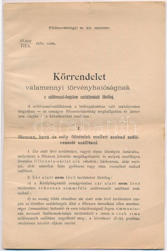 1890 Körrendelet a szőlővessző-forgalom szabályozását illetőleg, írta ... https://www.darabanth.com/de/277-Fernauktion/277.0/Andere-Sammelgebiete/Drucksachen~28/1890-Korrendelet-a-szolovesszo-forgalom-szabalyozasat-illetoleg-irta-Bethlen-Andras-fold~II1418156