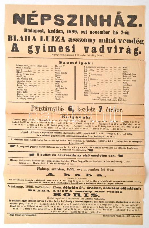 1899 Bp., Népszínház, Blaha Lujza vendégszereplése az "A gyimesi vadvi... https://www.darabanth.com/de/277-Fernauktion/277.0/Andere-Sammelgebiete/Drucksachen~28/1899-Bp-Nepszinhaz-Blaha-Lujza-vendegszereplese-az-A-gyimesi-vadvirag-c-darabban-plaka~II1421683