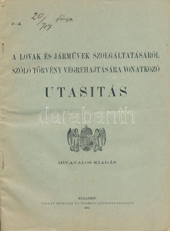 1913 Bp., A lovak és járművek szolgáltatásáról szóló törvény végrehajtására vonatkozó utasítás, táblázatokkal, kiadja Pallas Irodalmi és Nyomdai Részvénytársaság, 65p