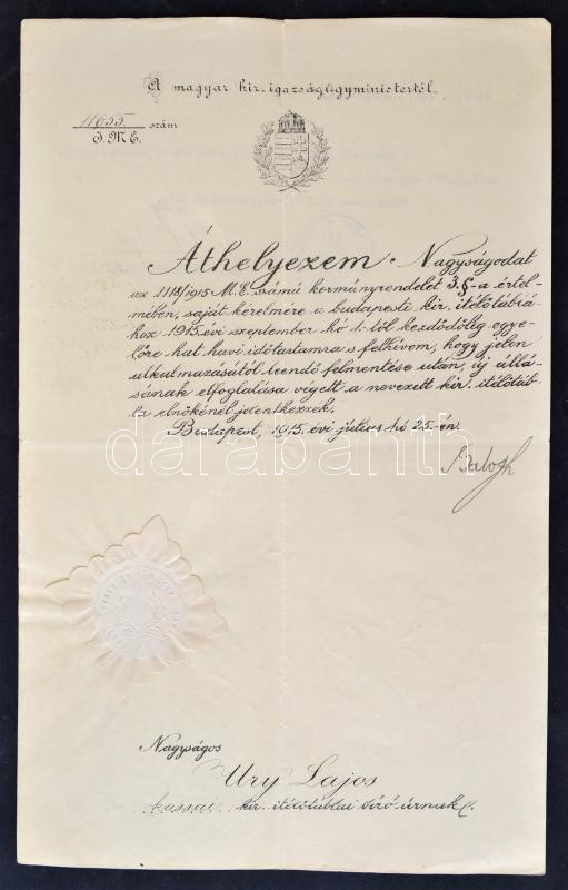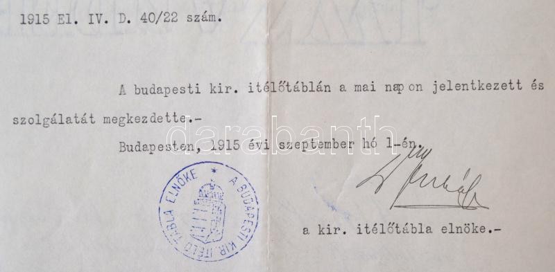 Beschreibung: 1915 Balogh Jenő (1864-1953) magyar jogász, politikus, miniszter saját kezű aláírása a magyar kir. igazságügyminiszter fejléces papíron, 34x21cm