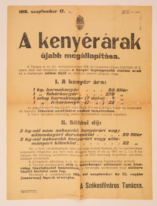 1918 Bp., Hirdetmény a kenyérárak újabb megállapításáról, szakadásokka... https://www.darabanth.com/de/277-Fernauktion/277.0/Andere-Sammelgebiete/Drucksachen~28/1918-Bp-Hirdetmeny-a-kenyerarak-ujabb-megallapitasarol-szakadasokkal-63x46-cm~II1423037