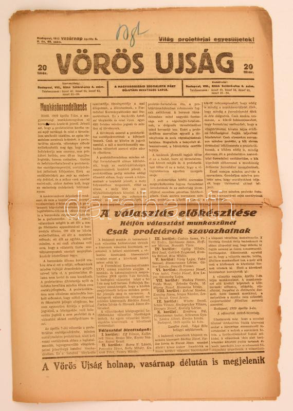 1919 a Vörös Újság 2. évf. 49. lapszáma, számos érdekes írással https://www.darabanth.com/de/277-Fernauktion/277.0/Andere-Sammelgebiete/Drucksachen~28/1919-a-Voros-Ujsag-2-evf-49-lapszama-szamos-erdekes-irassal~II1421765