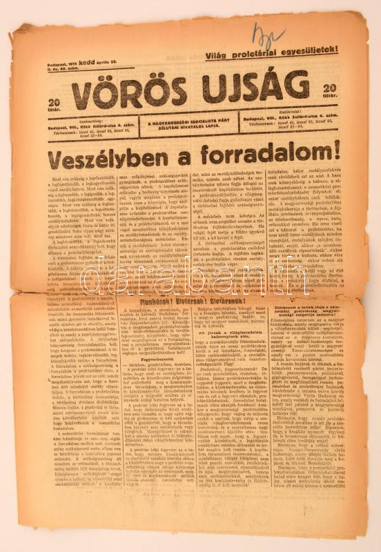 1919 a Vörös Újság 2. évf. 63. lapszáma, számos érdekes írással https://www.darabanth.com/de/277-Fernauktion/277.0/Andere-Sammelgebiete/Drucksachen~28/1919-a-Voros-Ujsag-2-evf-63-lapszama-szamos-erdekes-irassal~II1421783