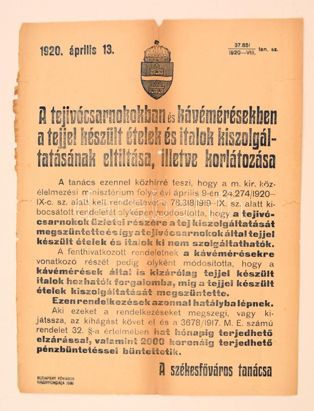 Beschreibung: 1920 Budapest városi tanácsának rendelete a tejjel készült ételek és italok korlátozásának tárgyában (ápr. 13.), hirdetmény, szélein kis szakadásokkal, 31,5×24 cm