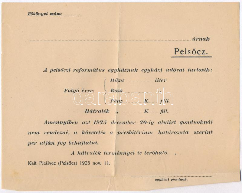 1925 Pelsőci Református Egyház, kitöltetlen fizetési felszólítás, hajt... https://www.darabanth.com/de/277-Fernauktion/277.0/Andere-Sammelgebiete/Drucksachen~28/1925-Pelsoci-Reformatus-Egyhaz-kitoltetlen-fizetesi-felszolitas-hajtva-ununsed-payment-o~II1418253